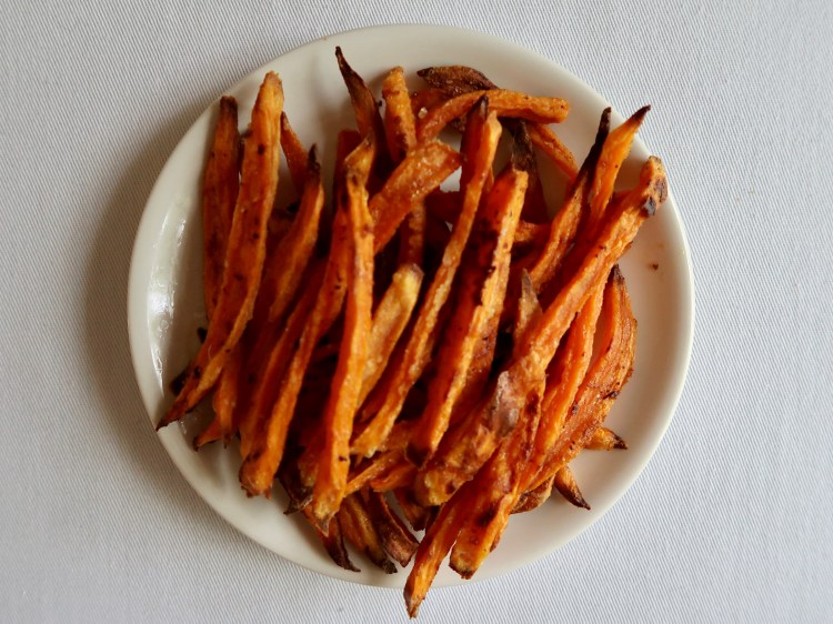 Julia’s preference for sweet potatoes combined with the simple preparation and outstanding taste of these oven fries has made them a favorite in our house. We enjoy them once a week on burger night alongside veggie burgers.
